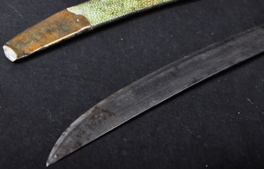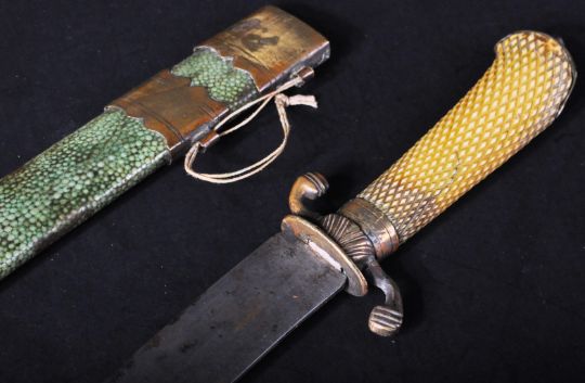 An 18th Century English hunting sword / hanger having a Lions head pommel and textured ivory grip with a sweeping quillon crossguard. The sharp single edged blade housed in a shagreen lined wooden scabbard with brass mounts. Measures approx 60cm.
