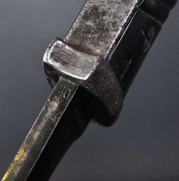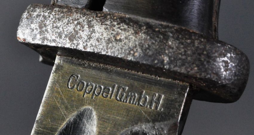An original WWII Second World War 1940 dated Third Reich Nazi German K98 Mauser rifle bayonet. The bayonet having a ' bird's head ' pommel with push release button and black Bakelite ribbed grip. The ricasso marked for makers Coppel G.m.b.H with 1940 date to the blade spine and the matching steel scabbard. Measures approx 40cm.