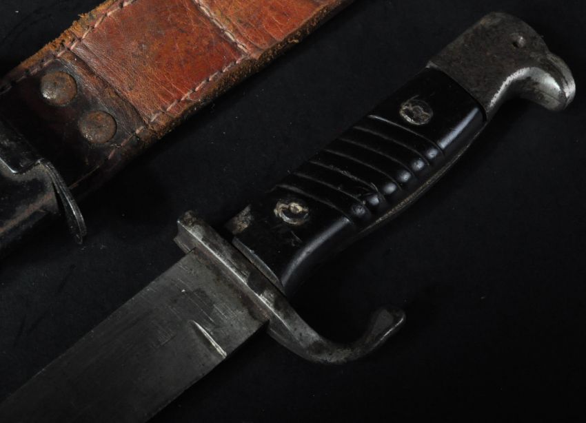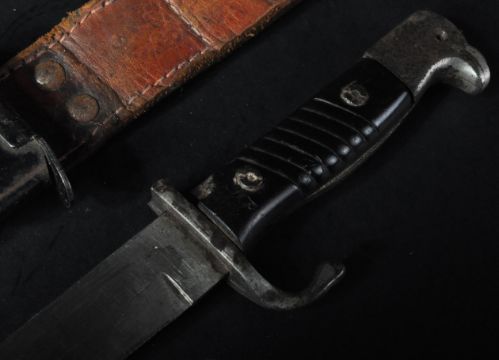 A WWII Second World War period German Third Reich trench warfare fighting knife in the manor of a German bayonet. The knife having a hooked ' birds head ' pommel, ribbed Bakelite grip and backward facing quillon. Housed in a US United States type scabbard. Measures approx 32cm.