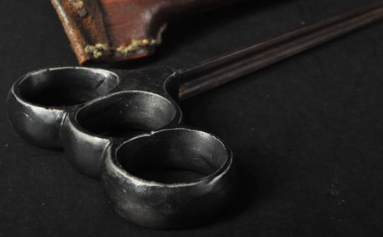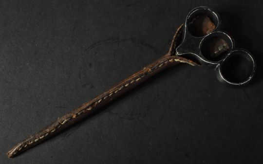 An original WWI First World War era British Special Ops type trench combat knife / thrust dagger. The triangular section blade having a three finger hilt. Housed the original brown leather scabbard. Measures approx 20cm.