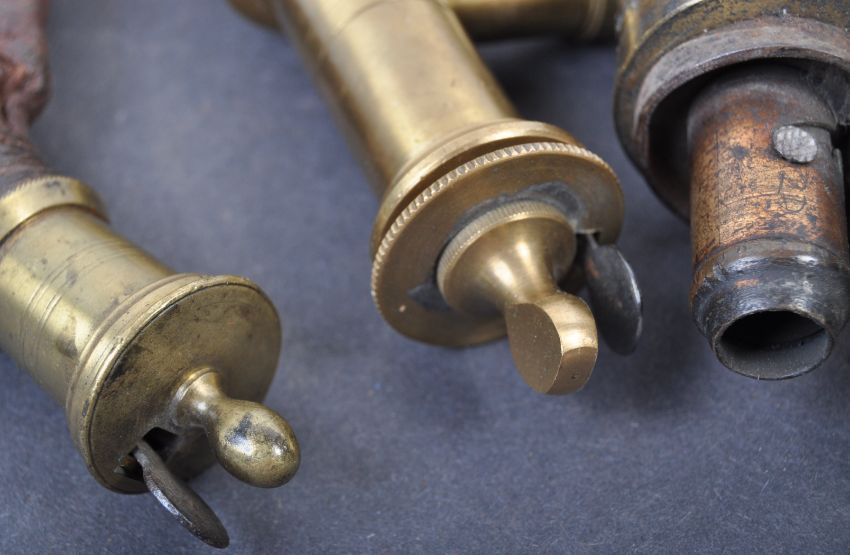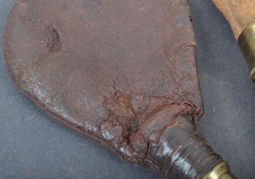 A collection of x4 antique 19th century musket rifle powder flasks. One a copper example with pressed foliate motif to both sides, another similar with a crest to both sides, and two leather powder flasks. No maker's marks present.