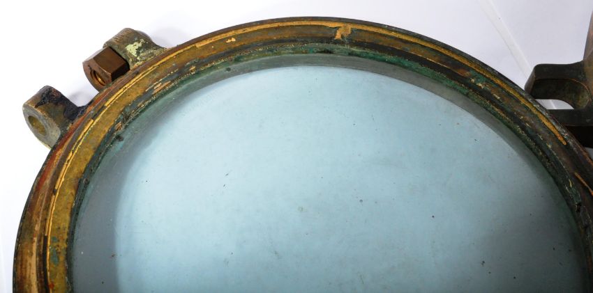 A pair of early 20th Century believed WWI First World War period ship porthole windows. Sold bronze outer rim with hinged edge and a thick glass inner. Each to measure approx 30cm.