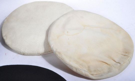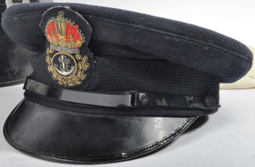 Two WWII Second World War period 1940's Royal Navy Officers peaked uniform caps belonging to one Chief Petty Officer D. Kemp. A standard service navy blue dress cap with bullion badge to the front and a white summer example. Housed within an Admiralty Sailors hat tin with name to the lid.