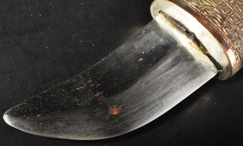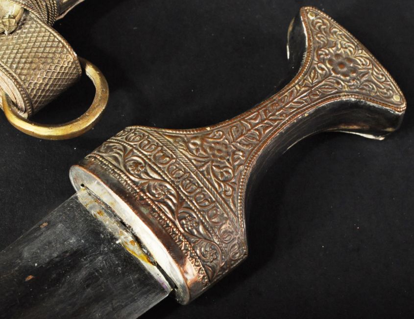 A late 19th Century Middle Eastern believed Omani Khanjar / Jambiya ceremonial dagger. The dagger having a Rhino horn hilt capped with white metal mounts is housed in a scabbard intricately carved with floral patterns and filigree work. Measures approx 30cm overall.