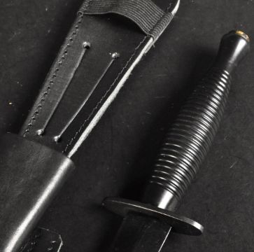 An original current issue FS Fairbairn Sykes British commando knife dagger. The knife having a nut to the pommel, ribbed handle and a cross guard stamped with broad arrow marks and ' Sheffield England '. The ebonised steel blade housed in a black leather scabbard. Measures approx 30cm.