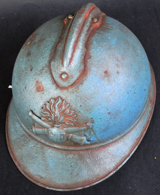 A WWI First World War period French Artillery M15 steel combat Adrian helmet. Steel construction with split pin ' comb ' and RF artillery badge to the front. Distinctive seam around the brim. No liner or chin strap present. A believed barn find.
