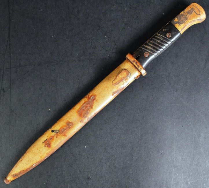 A WWII Second World War Third Reich Nazi German Afrika Korps K-98 Mauser rifle bayonet. Hooked pommel with push release button and DAK engraving. The ricasso stamped for makers AWS for Alexander Coppel. Housed in a ' desert paint ' steel scabbard. Measures approx 41cm.