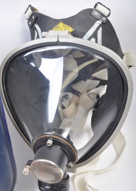 An original British ' Siebe Gorman & Co Ltd ' post WWII Second World War ' Puretha ' gas mask / respirator with carry case. The respirator having a black rubber full face shield with headbands intact. A black hose and canister dated 25th January 1969. Yellow rubber webbing accessories for neck and chest harness present. Complete with instructions and blue hard carry case depicting the Siebe Gorman branding.