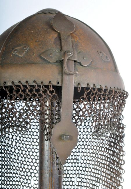 A 19th Century model of a 15th / 16th Century medieval chainmail helmet on a good oak wood stand. The flexible curtain of armour mail attached to the lower border of the skull helmet by a series of rivets. Measures approx 77cm tall.