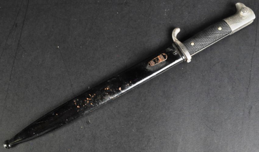 A WWII Second World War Third Reich Nazi German parade uniform / K98 rifle bayonet. Hooked ' birds head ' steel pommel with push release button, black chequered grip and backwards facing quillon. Makers mark to the ricasso for Rich. Abr. Herder. The fullered blade housed in a black steel scabbard. Measures approx 40cm.