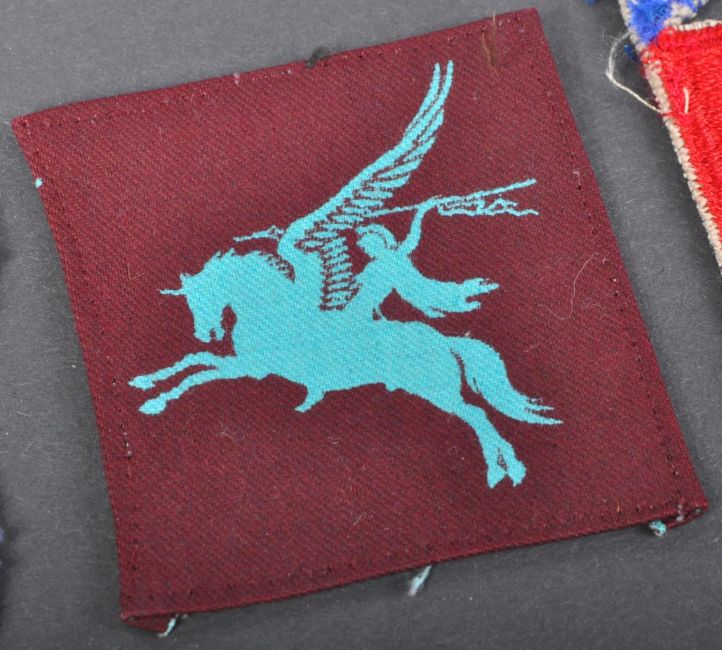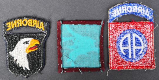 A collection of three 20th Century WWII Second World War British and US United States Airborne division formation cloth patch badges comprising; US 82nd and 101st Airborne division ( Normandy ) and British 1st / 6th Airborne division ( France & Germany ).
