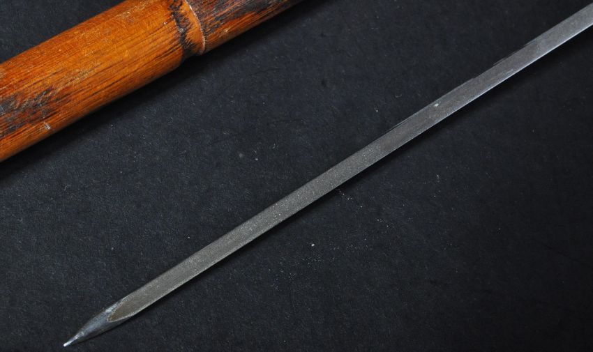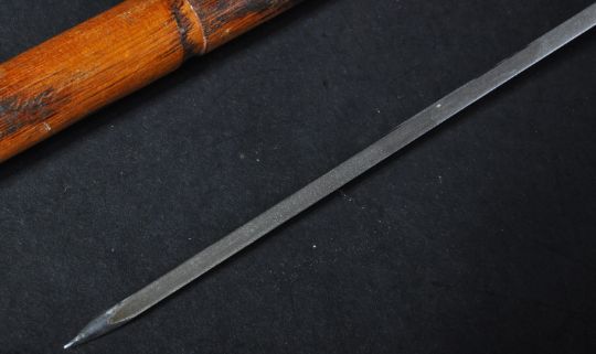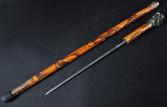 A 19th Century Victorian gentleman's ( likely Masonic ) sword stick / walking cane with concealed blade. The cane having a skull to the pommel and brass collars to the grip.  The cruciform stiletto blade housed a hardwood / bamboo sheath with a medieval / masonic cross badge. Measures approx 77cm.