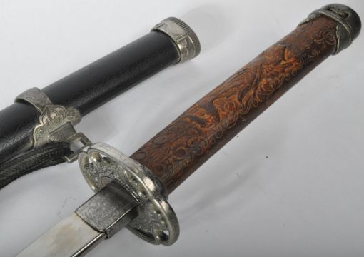 A 20th Century Japanese style Katana / Samurai sword. The sword having a steel capped pommel and wooden hilt carved with mythical dragons and scrollwork. The pierced tsuba guard leading to a long single edged blade housed in a leather wrapped steel scabbard. Measures approx 91cm.