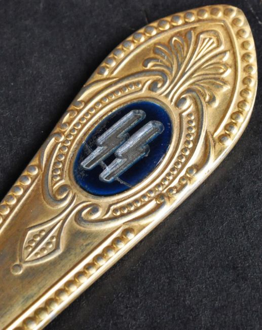 A WWII Second World War interest Third Reich Nazi German Waffen SS gold plated desert spoon. SS runes inlaid to the handle and Solingen makers mark to the reverse. Likely fantasy piece.