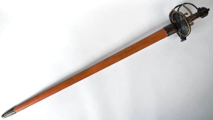 A 20th Century re-enactment Oliver Cromwell sword with a basket guard hilt and a black pierced guard decorated in a gold foliage pattern with a wire-wound sharkskin grip. The single edge fullered blade housed in tan leather scabbard typical of that period. Measures approx 105cm.