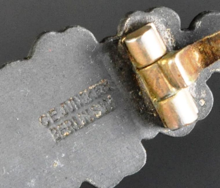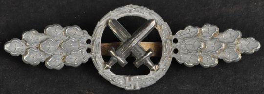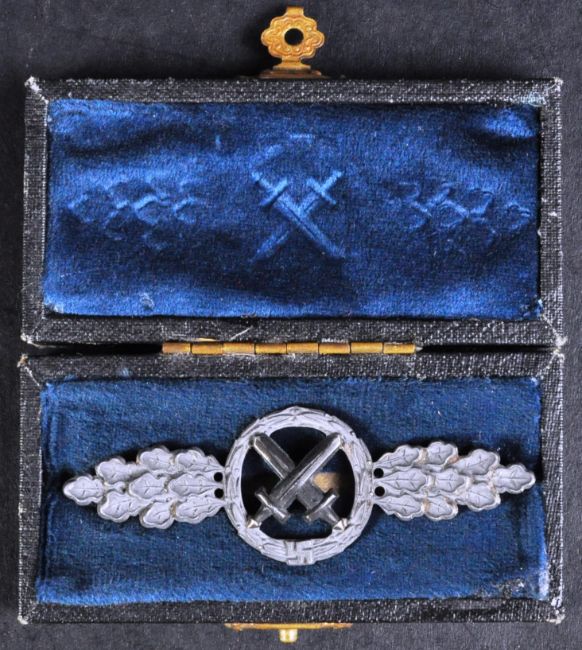 A WWII Second World War Third Reich Nazi German Luftwaffe Front Flying Clasp for Air to Ground support fighters. The badge being a silver class example depicting two crossed swords encircled by a wreath of laurel leaves set between two stylized wings of oak leaves. Makers mark to the reverse for C. E Juncker, Berlin. Measures approx 7.5cm. Housed within the original box.