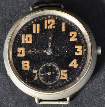 An original WWII Second World War British RAF Royal Air Force pilots wristwatch. Black dial with luminous Arabic numerals and a seconds dial. Broad arrow inspection mark to the reverse with serial number 96329M. Not currently working.