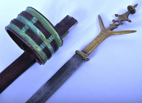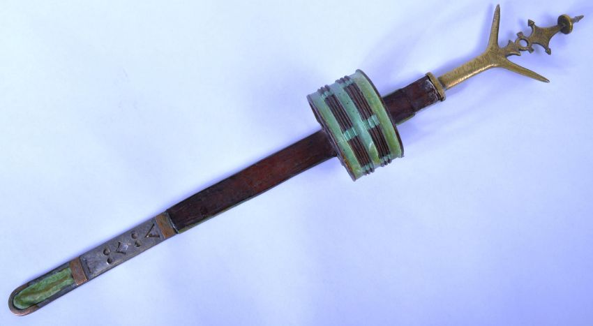 A 19th century Sudanese / African Tuareg Gozma tribal arm dagger. Tri-tipped pommel in brass, leading to a double edged blade. Housed in a decorative leather tool worked scabbard, with aluminium engraved panel work, and a hooped leather arm support. Total length approx; 57cm long.