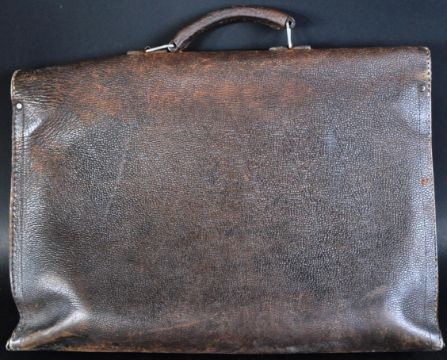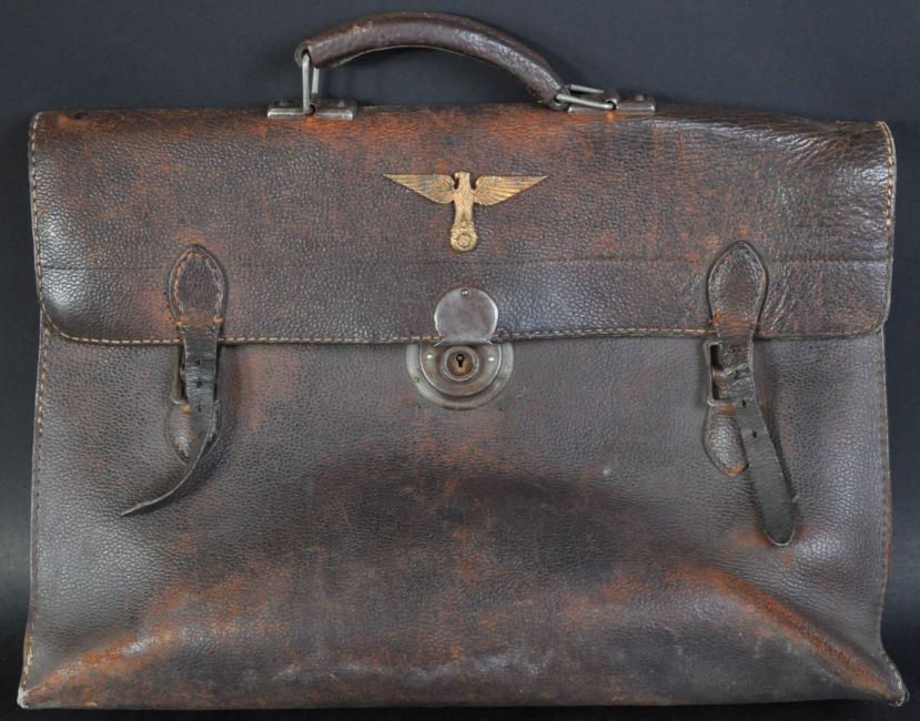 A WWII Second World War era leather briefcase. Brown leather construction with x2 inner compartments and applied Third Reich Nazi eagle and Swastika metal badge to the outer flap. Measures approx 30x45x9cm.
