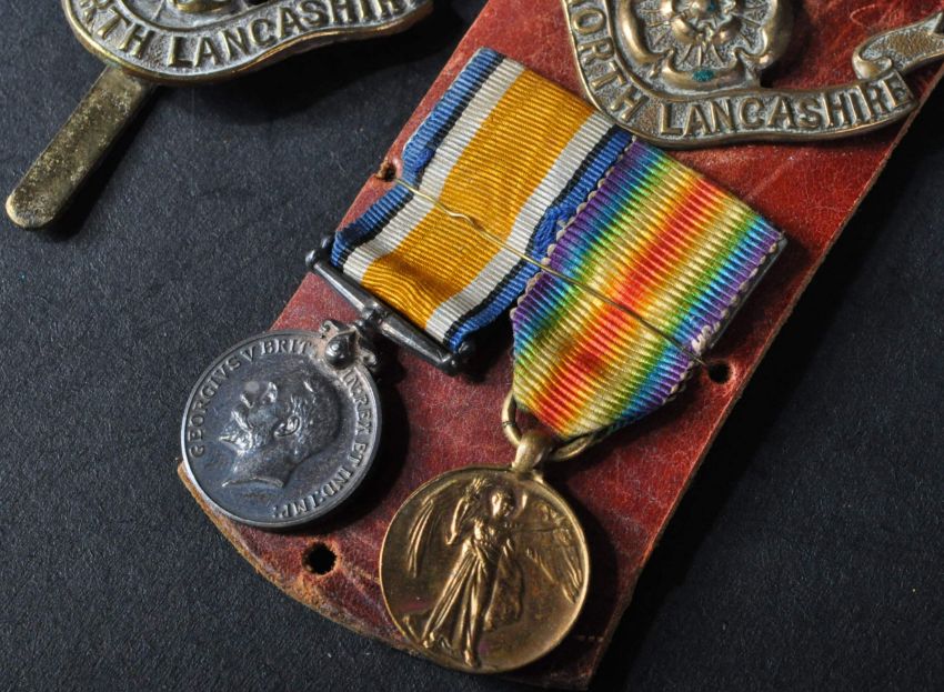A collection of WWI First World War Royal Lancashire Regiment war medals and cap badges. Miniature medals comprising the War Medal and Allied Victory medal on original ribbons along with two Loyal North Lancashire cap badges.
