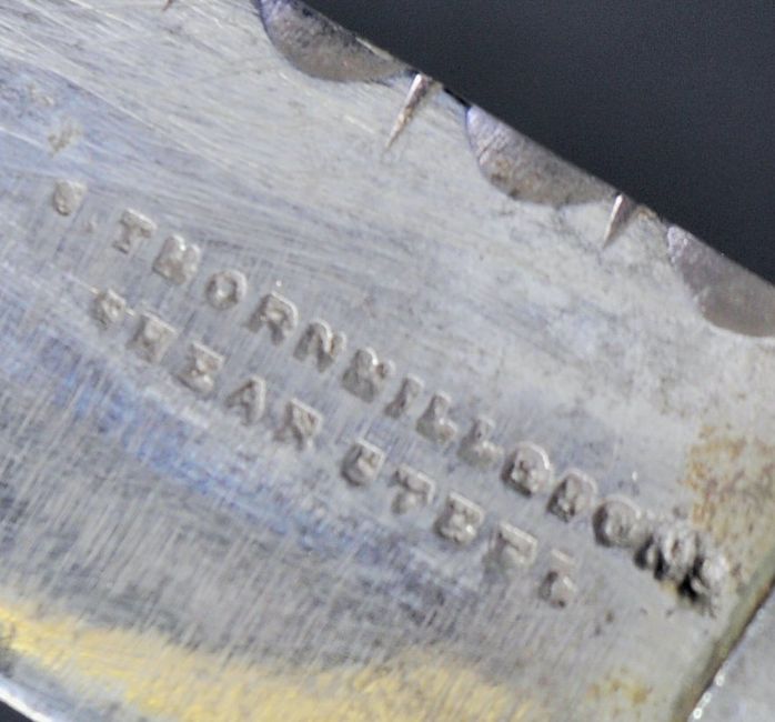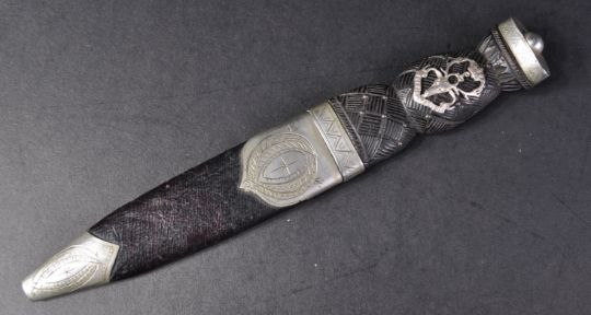 An early 19th Century 78th Scottish Highlanders Sgean Dubh / Skean Dhu / ceremonial dress dagger. The dagger having white metal ball finial to the pommel and a carved basket weave wooden grip with 78th Highlanders regimental badge. The serrated blade with makers mark for Thornhill & Sons housed in a leather wrapped wooden scabbard with carved metal mounts. Measures approx 21cm.