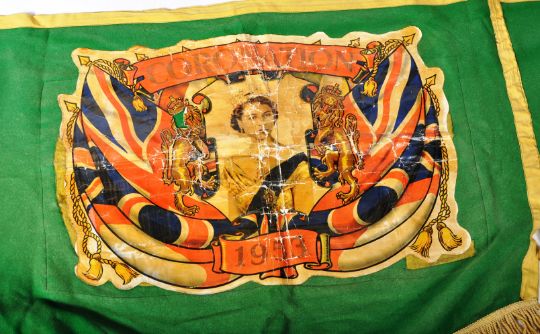 A large 1953 Queen Elizabeth II coronation flag / banner. The banner having a green felt background with a central image of The Queen flanked by Union Jack flags and the coat of arms. Finished with yellow tassels to the seam. Measures approx 78x195cm.
