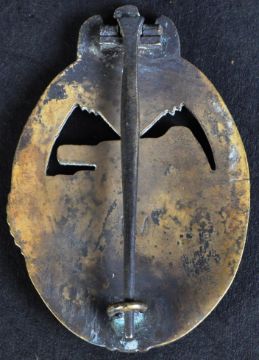 A WWII Second World War Third Reich Nazi German Panzer badge. A bronze grade example with a Panzer IV tank to the centre, surrounded by an oak wreath surmounted by the eagle and swastika. Brooch pin to the reverse and ' PM ' maker mark.