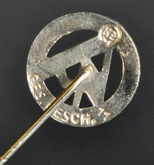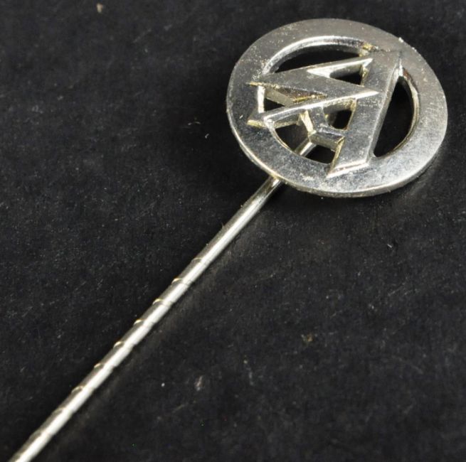 A WWII Second World War Third Reich Nazi German SA Storm Detachment lapel pin badge. Usual form with pieced SA emblem mounted to a twisted rope effect pin. RZM mark and Ges. Gesch to the reverse. Housed within the original box.