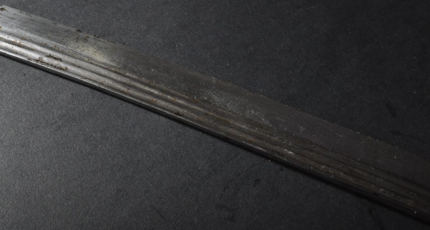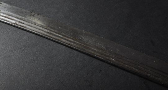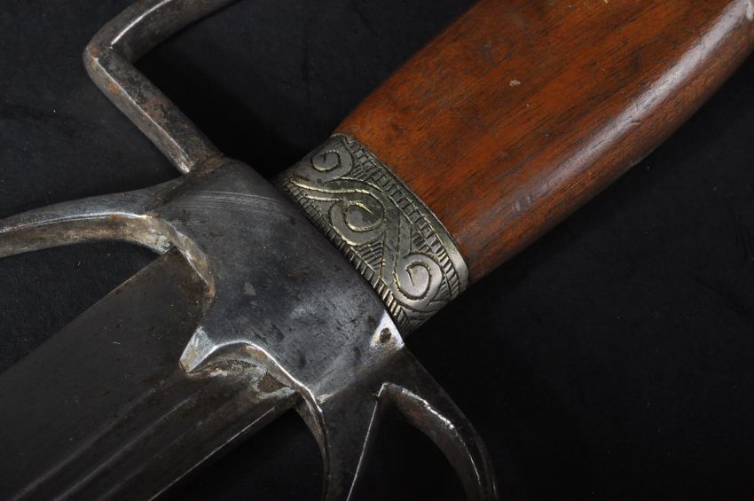 An early 19th Century Moroccan Nimcha sword. The sword having a wooden handle with a squared-off / hooked pommel, thin knuckle guard and a crossguard with x3 downward facing quillons. The blade slightly curved with a single edge and x3 fullers. Measures approx 92cm.