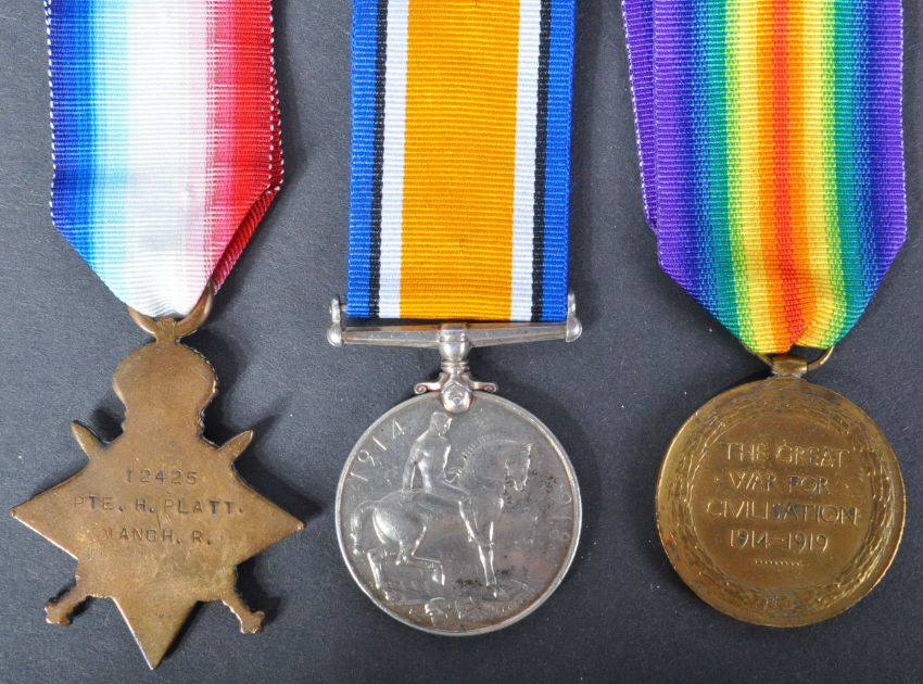 A WWI First World War medal trio group awarded to one 12425 Private H. Platt of the Manchester Regiment comprising War Medal, Victory Medal and 1914-15 Star. All with original ribbons. Officially impressed to rims and accompanying research / paperwork.