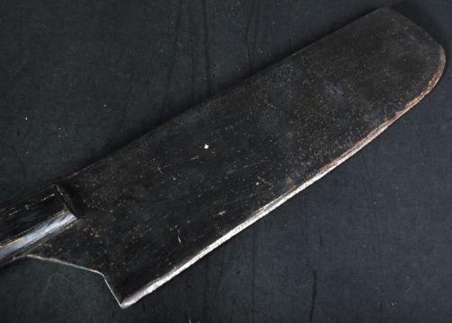 A large 20th Century butcher knife. Heavy black steel construction with a faint makers mark to the face ' TA SAR ' (?) and a painted wooden handle. Measures approx 75cm.