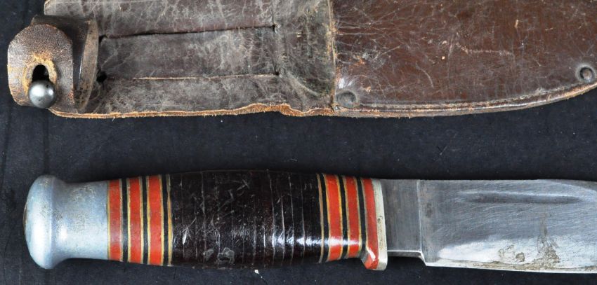 Two WWII Second World War British Army commando dagger / trench knives. Both knives having smooth steel pommels, x1 with a bone handle and the other a William Rogers style knife with a ringed leather grip. Both marked to the ricasso for Sheffield England and housed within brown leather scabbards. Each measuring approx 23cm.