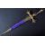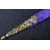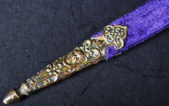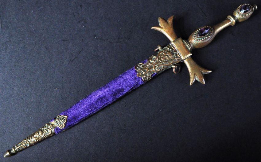 A 19th Century South European dirk / dagger. The dagger having a brass pommel and hilt inset with faceted cut Amethyst stones and a twin 3 petal cross guard. The double edged blade housed in a purple velvet wrapped scabbard with brass furniture depicting Satan and other gothic symbols. Measures approx 30cm.
