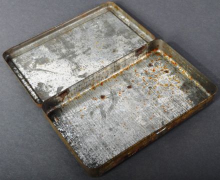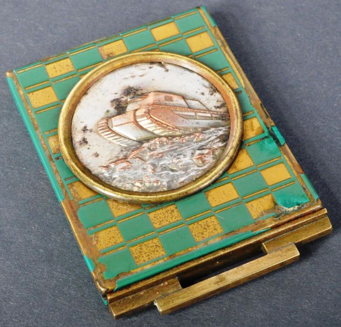 A collection of assorted WWI First World War and WWII Second World War items comprising; a square First World War period brass cigarette case with a central white metal tank badge, a WWII Second World War Women's Auxiliary Air Force (WAAF) compact mirror with RAF Royal Air Force badge and souvenir box commemorating a Royal visit to the opening The Royal Edward Dock in Bristol 1908.