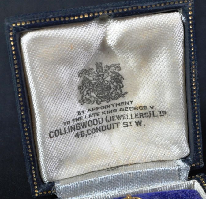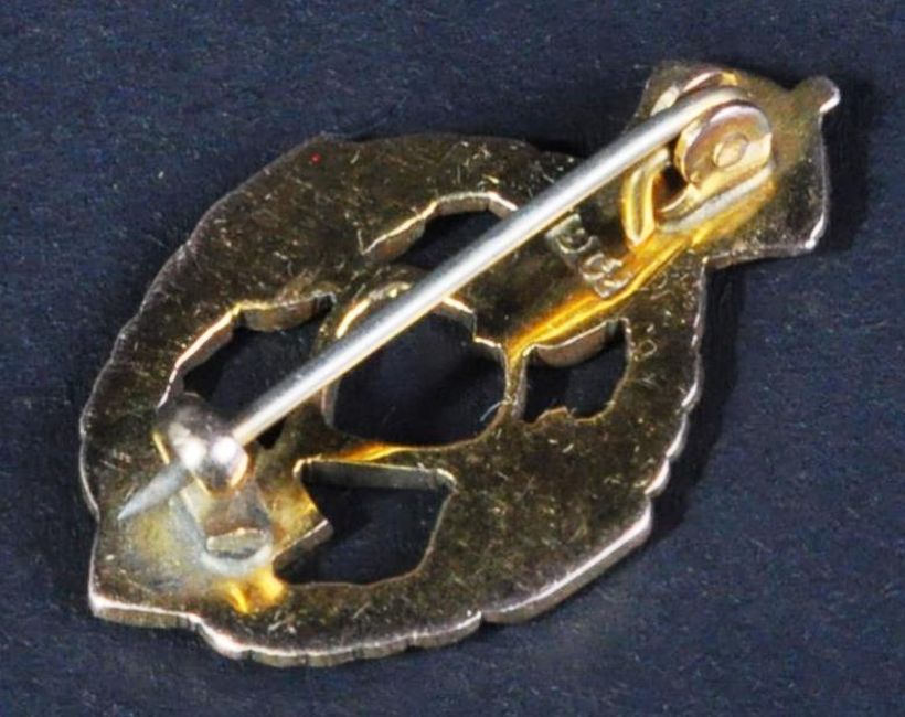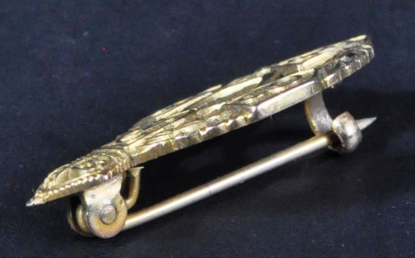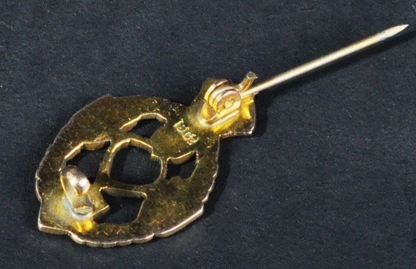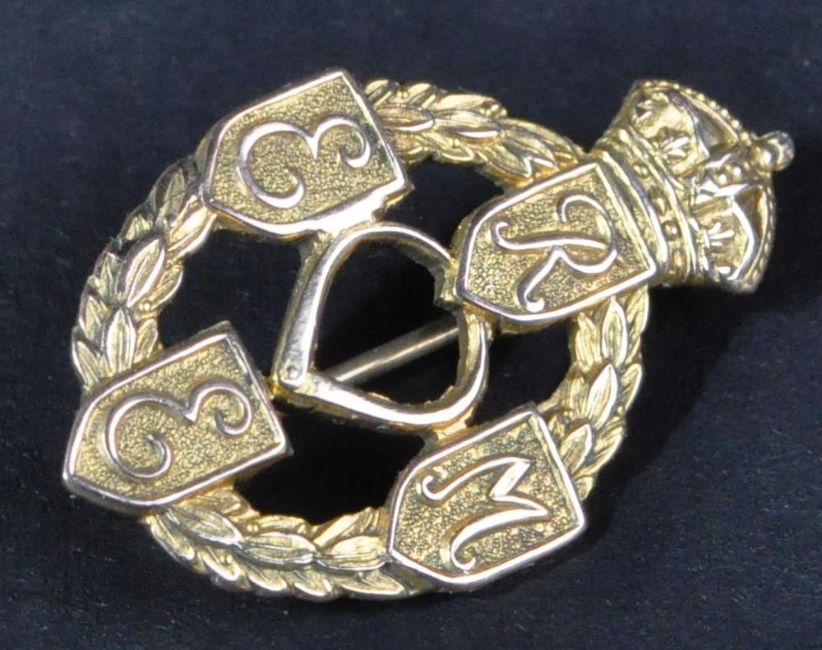 A WWII Second World War interest 9ct gold yellow metal REME Royal Electrical And Mechanical Engineers sweetheart type brooch. The brooch in the form of a miniature regimental cap badge, with pin back, stamped ' 9ct '. Housed in its original Collingwood Jewellers lined box. 4g.