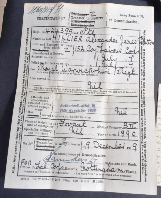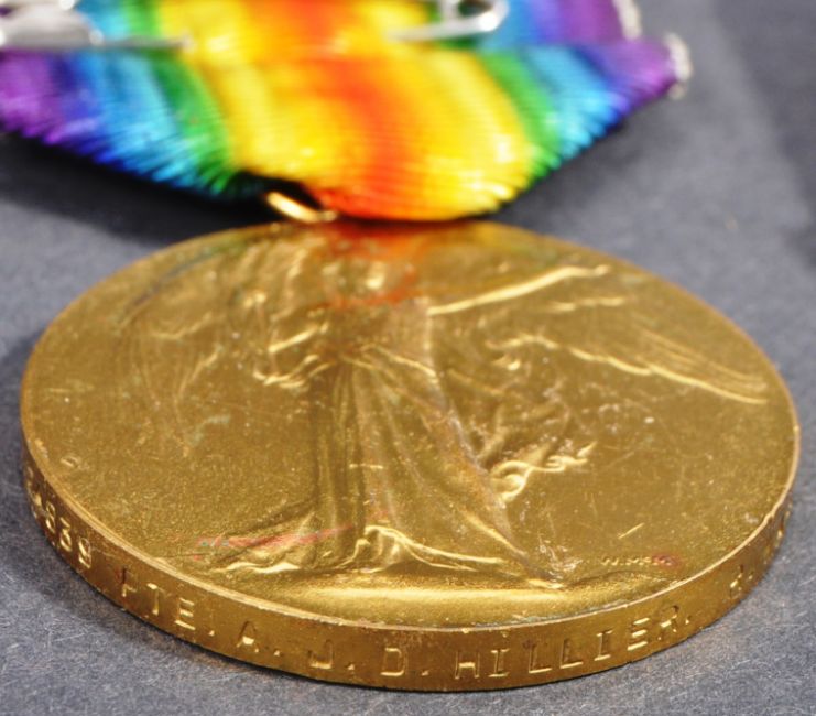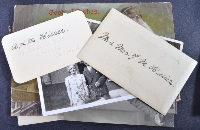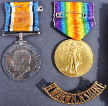 A WWI First World War medal pair awarded to one 24839 Private Alexander Hillier of the Royal Warwickshire Regiment. Lived in Redcliffe, Bristol. Comprising his War Medal and Victory Medal, with original ribbons. Also included are original postcards to and from his wife (whom he married on Dec 1st 1914, before being called up), including a lengthy written silk postcard from Alexander, and a charming sweetheart postcard from Minnie 'This picture rather nice on the front just like you and me. I hope and trust we'll be like that soon ', as well as other related postcards (some post-war cards to Minnie from other relatives). Includes several photographs of Alexander & Minnie in later years, as well as one of his original Royal Warwickshire Regiment shoulder badges. Poignant collection.