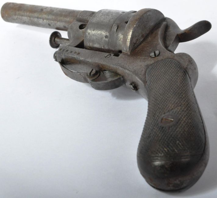 An original 19th Century French made pinfire revolver pistol / gun. The pistol having a round barrel, side gate loading, iron ejector rod and 2 piece chequered wooden grip. Marked to the barrel and chambre E.L beneath a crown. Serial number 215888 above the trigger. Calibre obsolete. Measures approx 18cm.