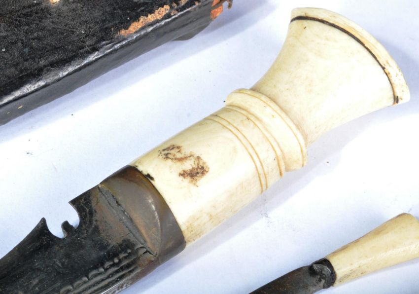 A WWII Second World War (possibly earlier) Middle Eastern made Gurkha Kukri knife / dagger. Carved bone handle in typical form, leading to a single edged curved blade. Complete with Chakmak and Karda smaller daggers. All housed in its original leather covered wooden scabbard. Total length approx; 42cm long.