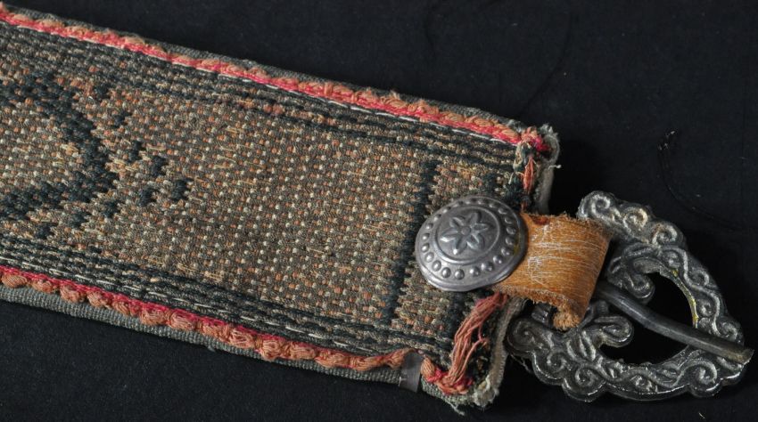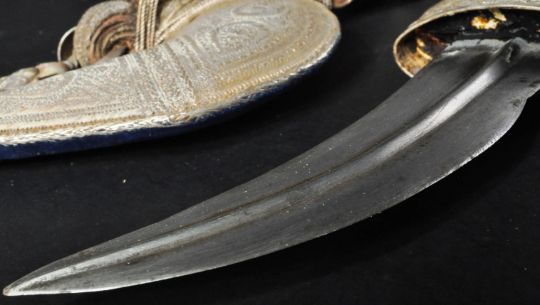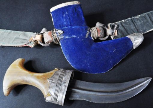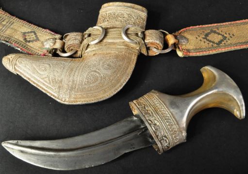 A 20th Century Middle Eastern / Omani Khanjar / Jambiya dagger. Dome shaped pommel with a Rhino horn waisted grip and a curved blade having pronounced central rib. Housed in an intricately decorated white metal scabbard with filigree decoration and silver rings woven into the scabbard. Retaining the original fabric belt.