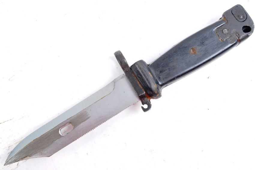 An original post WWII Second World War Egyptian AKM Type II Kalashnikov rifle bayonet dagger. The bayonet having a square steel pommel with push release button and smooth hard plastic grip. The cross guard with muzzle ring leading to serrated blade. Housed within original steel and rubber scabbard marked 0377. Measures approx 34cm.