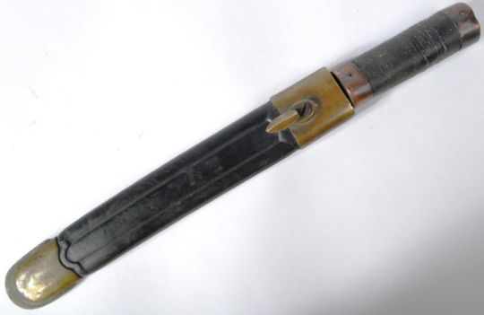 WWI First World War Italian trench warfare fighting knife likely fashioned from a M1891 rifle bayonet. Wooden grip wrapped with rope and a fullered single edged blade housed in a leather scabbard with brass mounts. Measures approx 36cm.