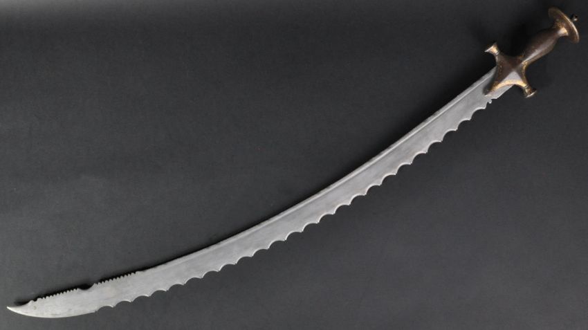 A 19th Century Indian Mughal Empire Tulwar ( Talwaar / Talwar ) sword with serrated saw blade. The sword having a disk shaped pommel and swollen hilt with cruciform cross guard decorated with Koftgari style detail. The curved serrated saw blade of low contrast Wootz Damascus blade. Measures approx 82cm.