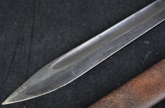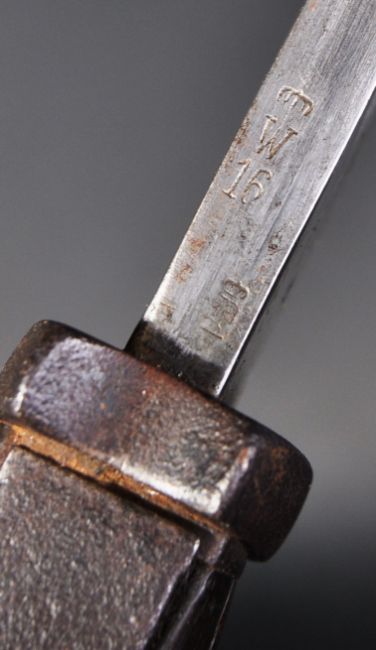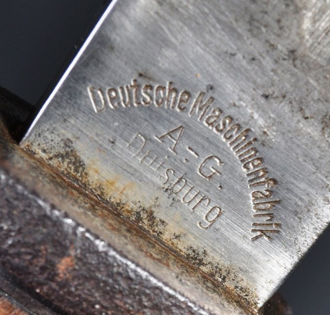 An original 1916 dated WWI First World War Imperial German Army Butcher Bayonet. Hooked pommel with push release button, ribbed wooden grip and backward facing quillon. The ricasso marked for makers ' Deutsch Machinen Fabrik Duisburg '. The fullered blade widening to the point housed in a steel scabbard. Measures approx 52cm.