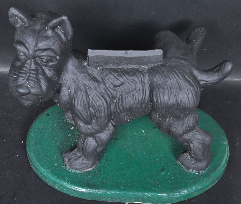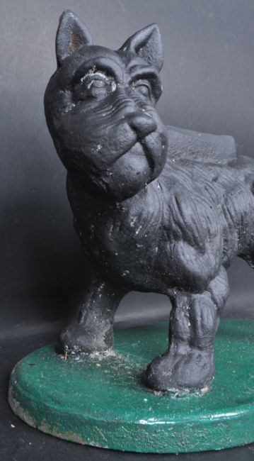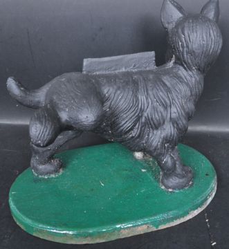 A large 20th century cast iron boot scraper in a form of a dog. The cast iron boot scraper in a form of a West Highland Terrier posing with a back leg lifted in the air raised on a plinth base.