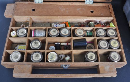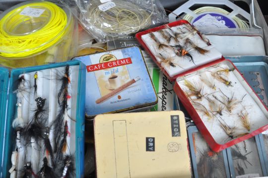 A large collection of vintage 20th century fly fishing equipment to include fishing reels, fishing hooks, fishing lines and fly fishing DIY equipment.