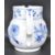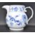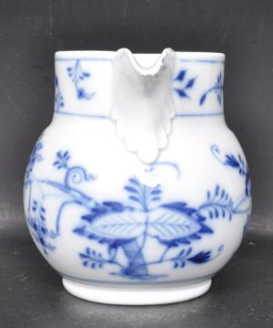 An early 20th century ceramic blue and white jug having floral patterning with flowers and an onion to the rim and body. Meissen mark to the base. Some damage to the spout. Measures 14cm tall.