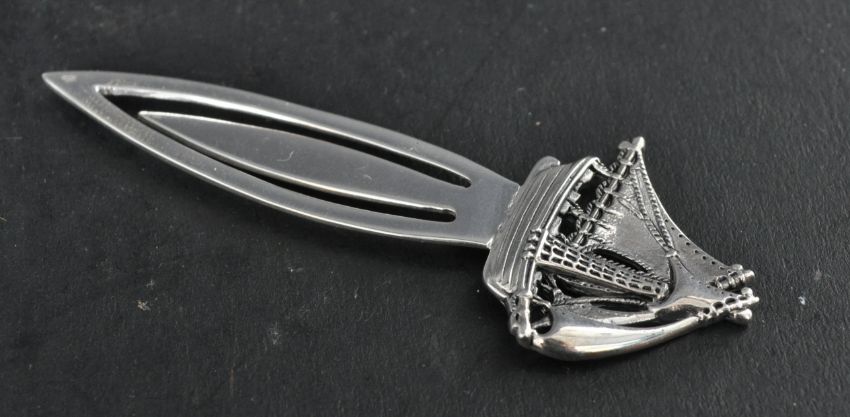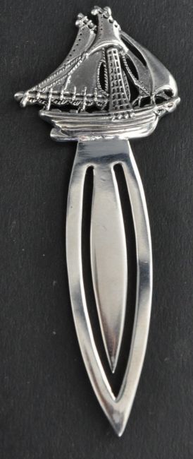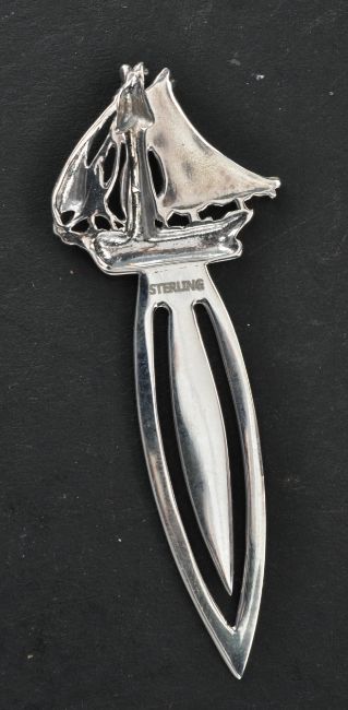 A sterling silver book mark having a finial to the top in the form of a sailing ship. Marked sterling to the verso. Measures 6cm. Weight 4.4g.