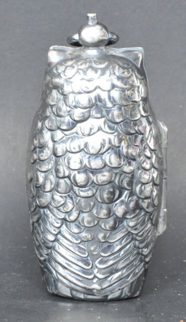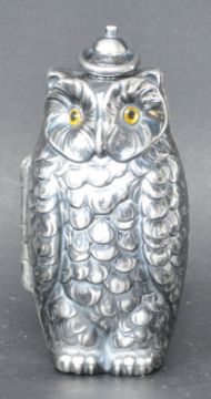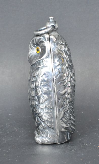 A vintage style silver plated owl shaped sovereign case. Having a ring to the top, push button, glass eyes, hinged side, and two sovereign holders to the interior. Measures 8cm tall.