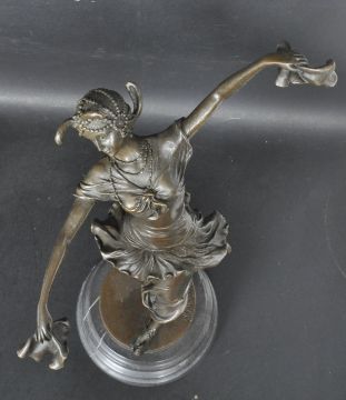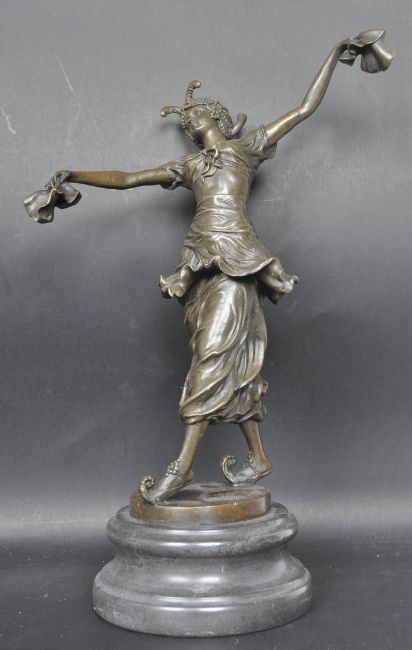 A vintage style bronze figurine of a dancing girl on a stepped marble base.The figure having a headdress, handkerchiefs in her hands and crakow type shoes. Makers stamp to the base. Measures 41cm tall.