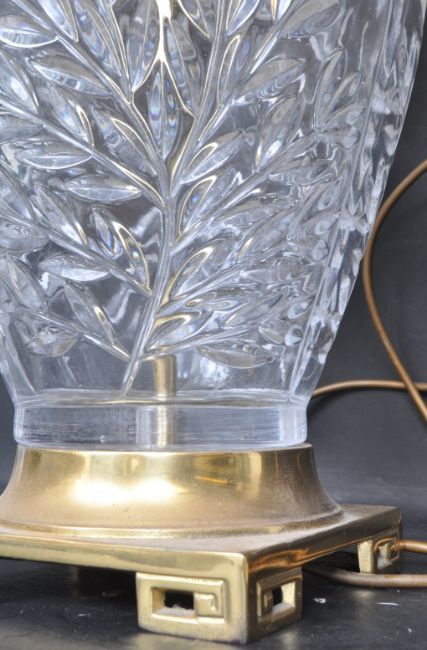 A retro vintage mid 20th century hand blown crystal glass Waterford crystal style table lamp by Nathan Lagin Co having impressed foliate decoration to the tapering ovoid body raised on a square base having Chinese geometric motifs to each corner. Measures 60cm high.